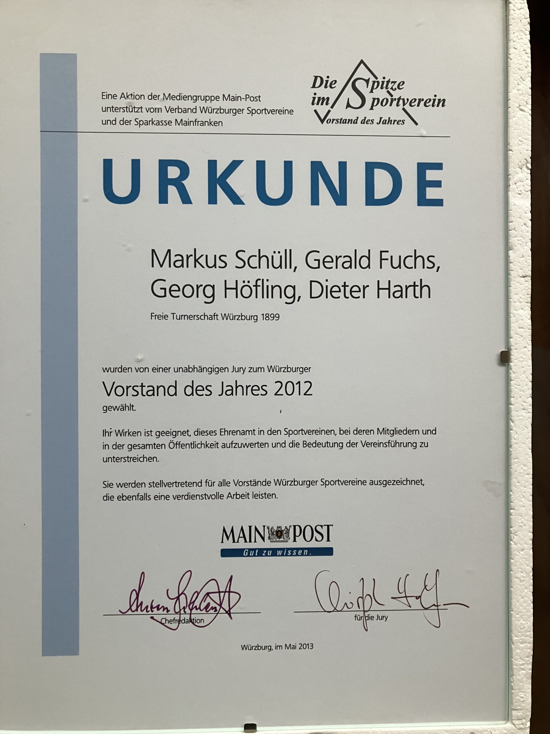 Als kleine Erinnerung sei hier noch mal die Urkunde erwähnt aus dem Jahr 2013, wo der Vorstand der Turner als “Vorstand des Jahres” 2012 ausgezeichnet wurde. Die Turner und ihre Erfoglsgeschichte …