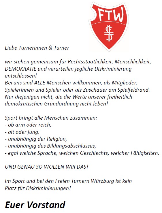 Die Vorstandschaft der Freien Turnen bekennen sich DEUTLICH zu einem offenen und diskriminierungsfreiem Umgang! Ein Klick auf das Bild direkt unter diesem Text zeigt euch den vollständigen Text.