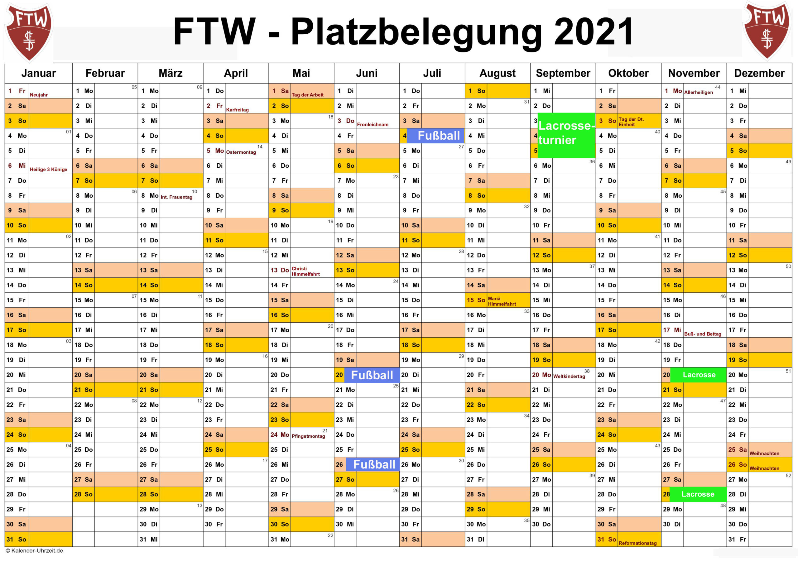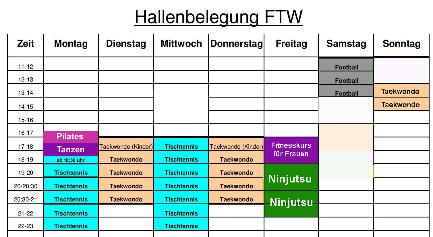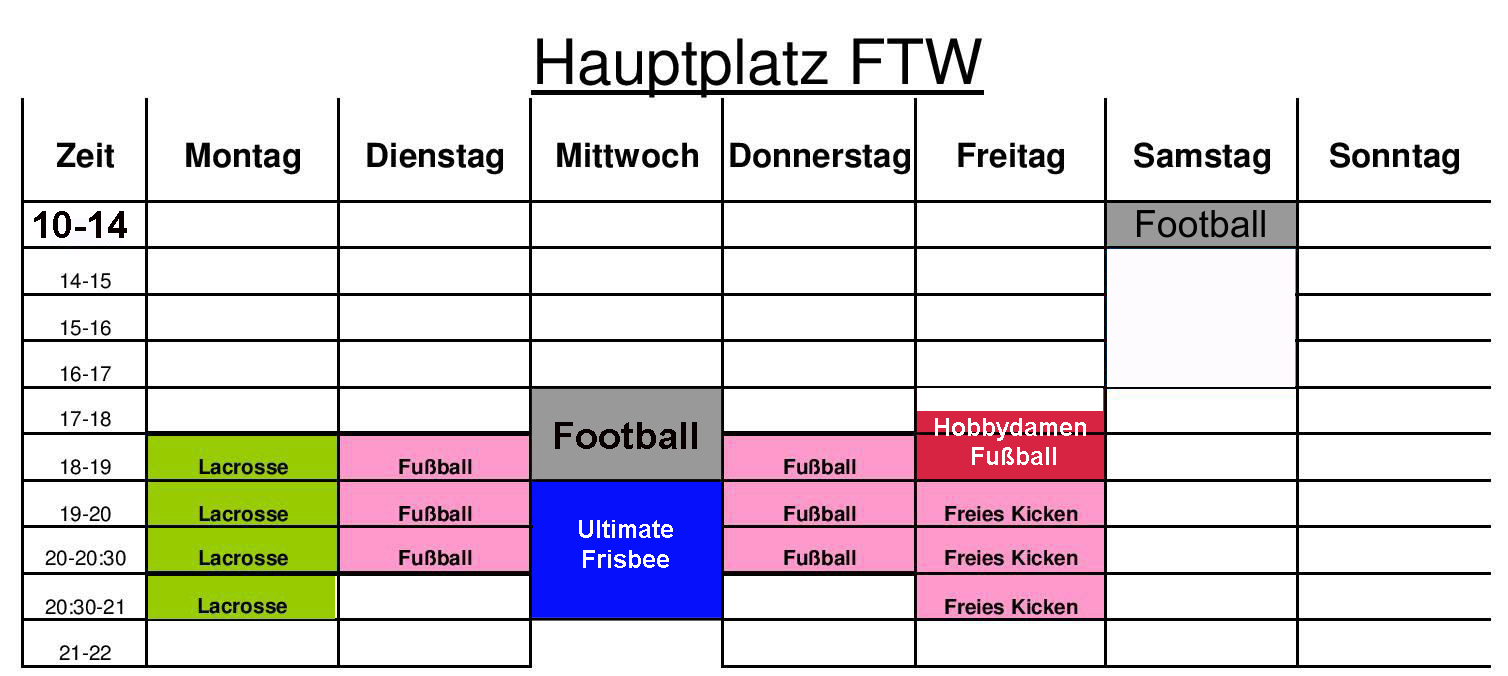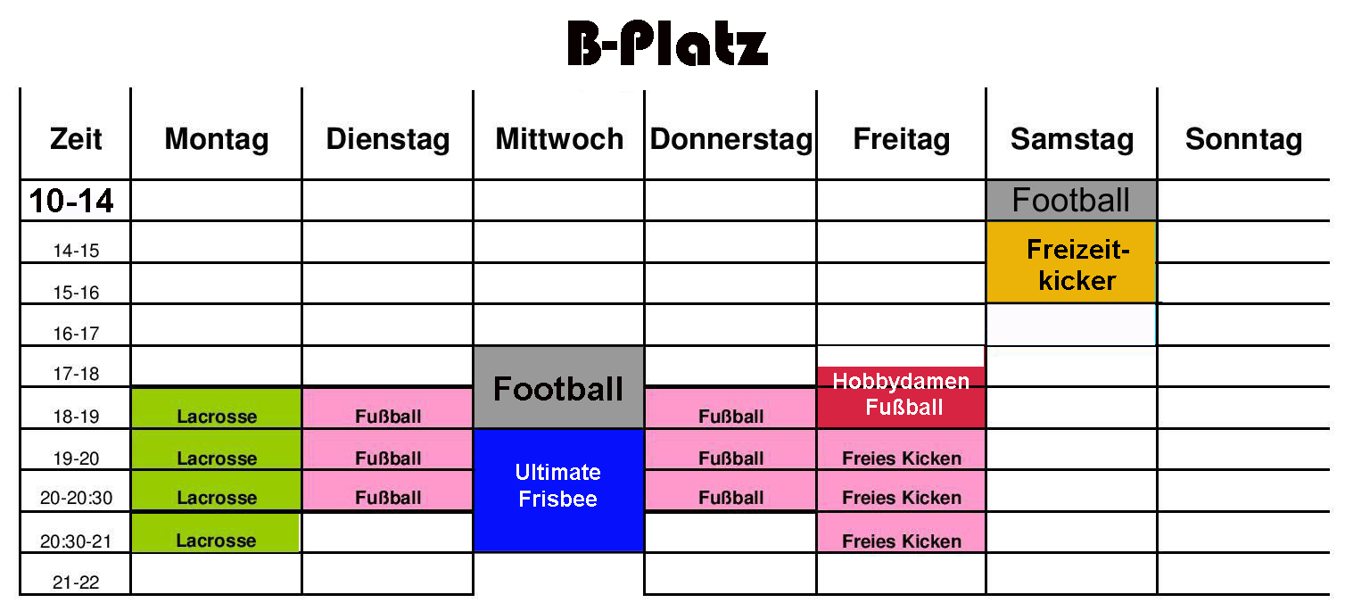 Auf dieser Seite stehen die Wochen-Belegpläne für die Halle, den Trainingsplatz sowie den Hauptplatz. Außerdem ist noch eine Übersicht angehängt, wann Veranstaltungen am Platz sind. Durch klicken auf den Plan, kann dieser vergrößert werden!